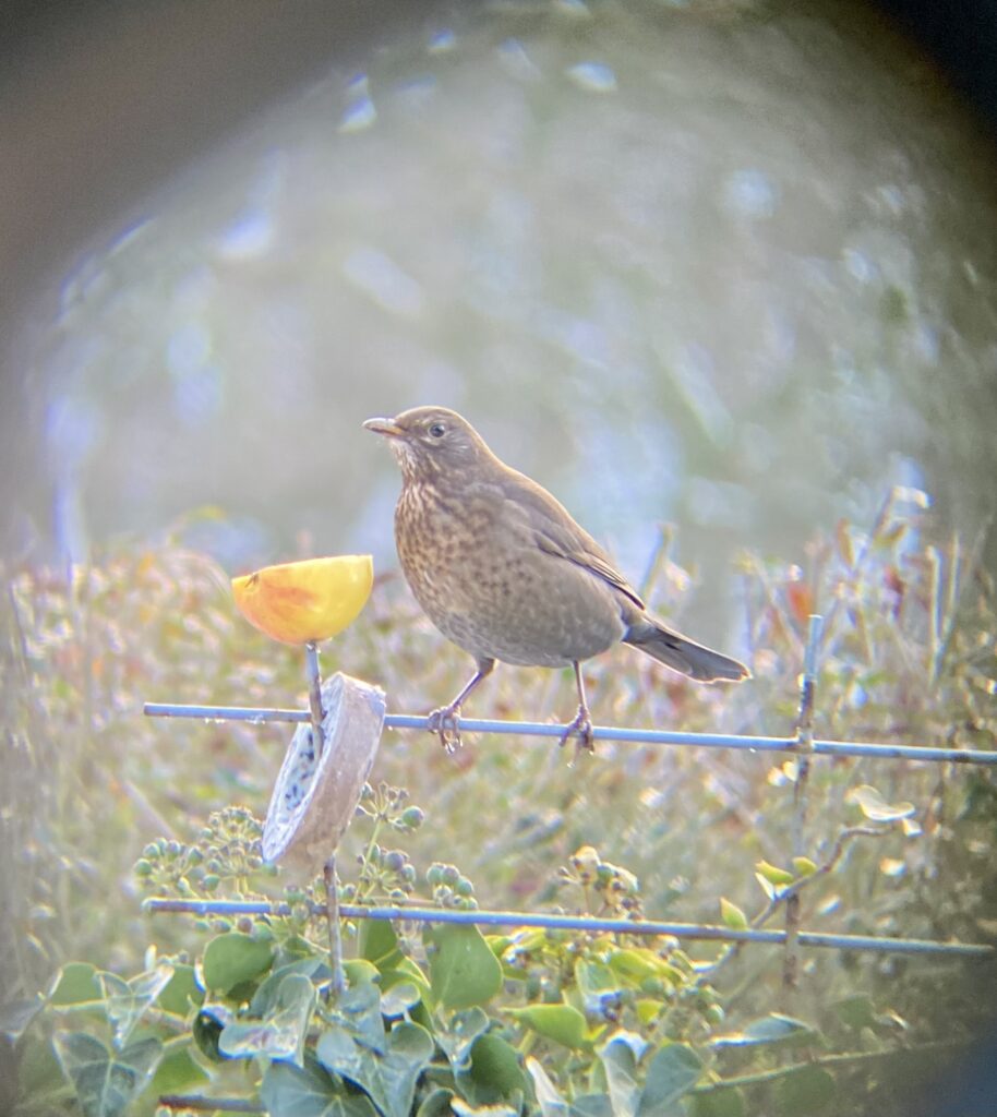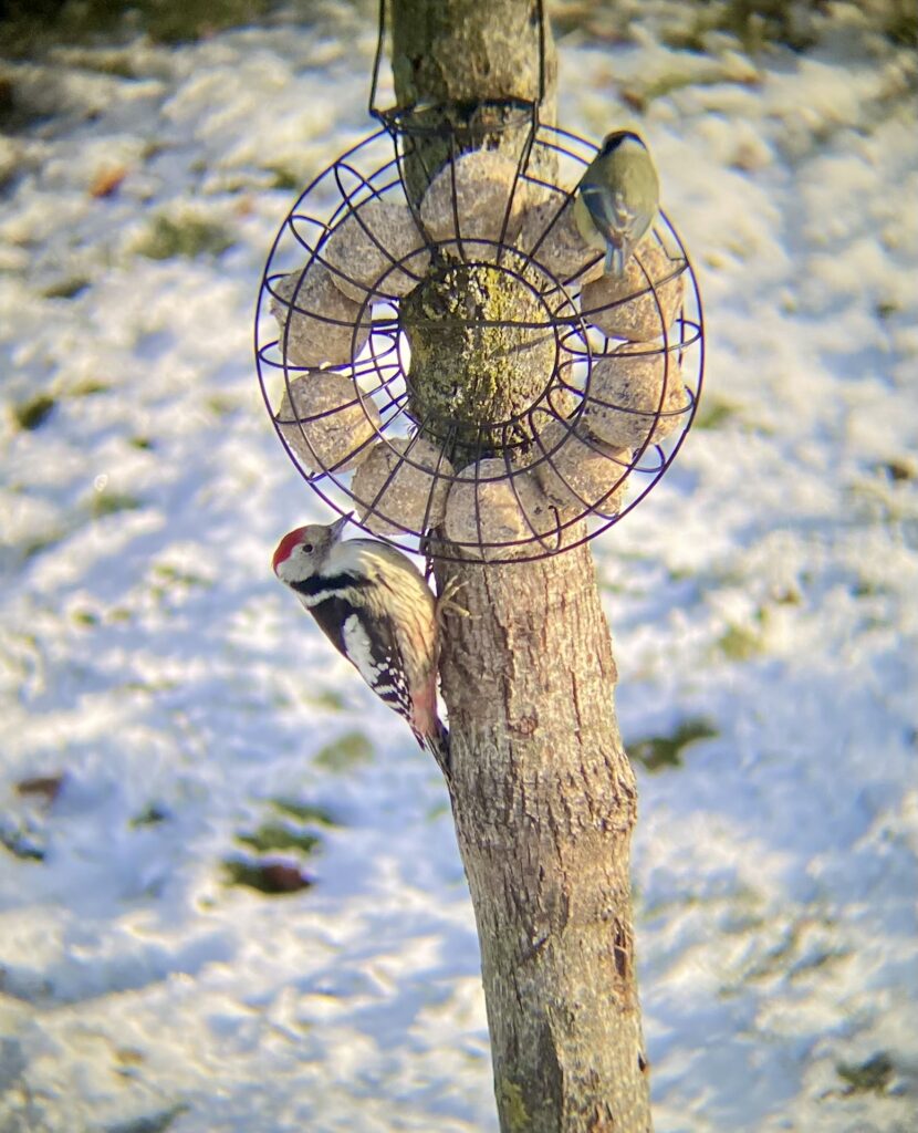 Ich vermute, dass es sich um ein heranwachsendes Männchen handelt. Es scheint dem Weibchen unterlegen, da es von ihr immer wieder von der Futterstelle verdrängt wird.