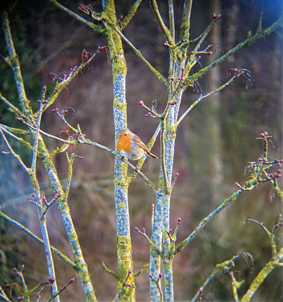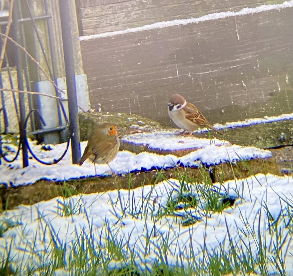 Das Rotkehlchen (links) und der Feldsperling (rechts) – in einem stillen Moment einander zugewandt.