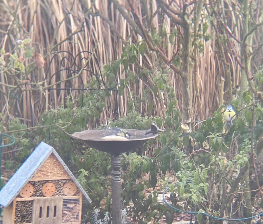 Nach einer frostigen Nacht schmelze ich morgens die zugefrorene Vogeltränke mit abgekochtem Wasser. Der aufsteigende Dampf schafft eine friedliche Atmosphäre und die Vögel nehmen es dankend an.