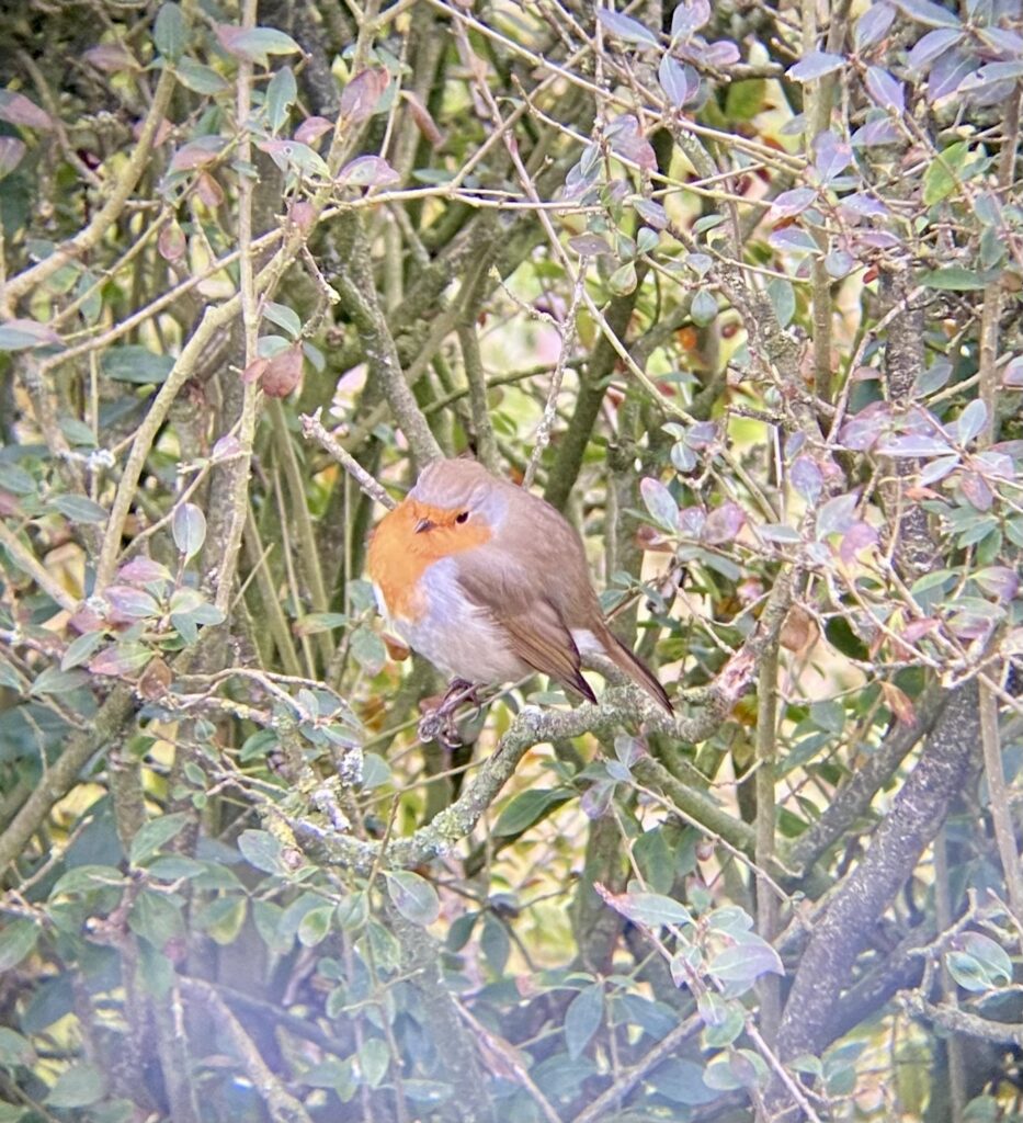 Das Rotkehlchen sitzt aufgeplustert in der Hecke und sucht Schutz – ein stiller Moment inmitten des unruhigen Wetters.